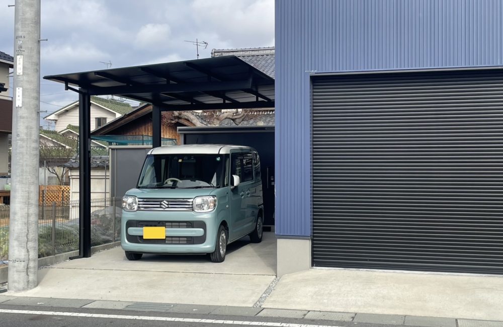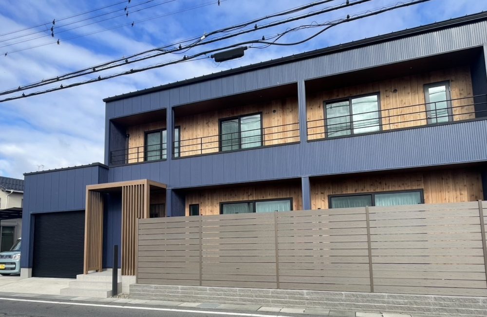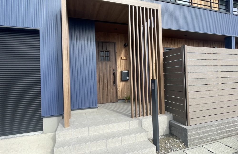 ネイビーのスタイリッシュな外観に、温かみのある木目調のフェンスと門柱を組み合わせた新築外構です。プライバシーを確保する高めの目隠しフェンスを設置しつつ、縦格子のデザインを取り入れることで圧迫感を抑え、開放感のあるエントラスに仕上げました。
